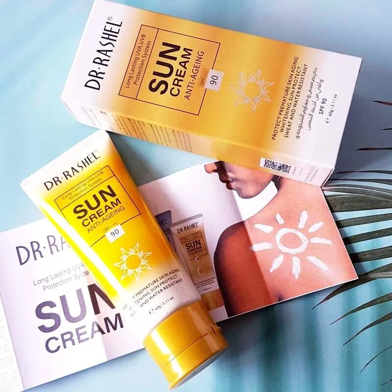 This is Dr Rashel Anti-Ageing Sun Cream SPF 90 60g provides strong sun protection and fights signs of aging. Its lightweight, non-greasy formula shields skin from harmful UV rays, reduces wrinkles, and keeps skin hydrated. Perfect for daily use, it leaves your skin smooth, radiant, and youthful while maintaining a healthy, glowing complexion all day long.