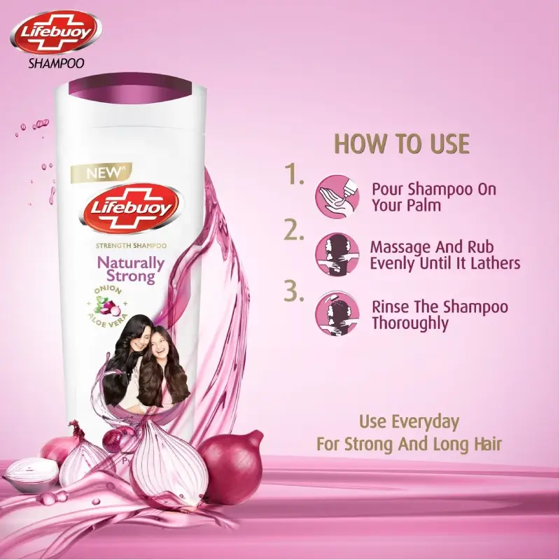 Buy Lifebuoy Naturally Strong Onion & Aloe Vera Shampoo 650ml, which combines onion & aloe vera to nourish & strengthen hair from roots to tips. It helps reduce hair fall, promotes healthier, shinier strands, & keeps the scalp refreshed. Its gentle, herbal formula cleanses deeply, leaving hair soft, manageable, & naturally strong—ideal for daily use for the whole family.